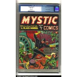 Mystic Comics #5 (Timely, 1941) CGC VF- 7.5 Off-white pages. This is a superior issue, in a run that is full of greatness. The incredible cover is rendered by Alex Schomburg, as is the interior art. This is the beginning of the German war covers, that ran until #10. This book is also a key because it is the origin of the Black Marvel, Blazing Skull, Sub-Earth Man, Super Slave and the Terror. The Moon Man and the Black Widow also appear. Overstreet 2002 VF 8.0 value = $1,875. Important notice: We expect to be auctioning lots at the rate of 200-250 per hour. Sometimes eBay Premier live bid software cannot keep up with that pace, so we strongly recommend that you place a realistic proxy bid now as insurance to avoid disappointment. Also please note that all Heritage/CAA lots purchased through eBay Premier carry a 20% Buyer's Premium.