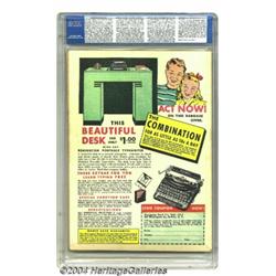 Mystic Comics #5 (Timely, 1941) CGC VF+ 8.5 Off-white to white pages. Alex Schomburg's cover art the depicts the Black Marvel interrupting a group of (presumably) German agents attempting to sabotage a U.S. munitions factory. Overstreet notes this as being the first in a run of German war-themed covers for this series. This issue has the origin of the Black Marvel, the Blazing Skull, the Sub-Earth Man, Super Slave, and the Terror. The Moon Man and Black Widow also appear. This sensational copy shows some very minor spine wear, and otherwise appears almost flawless. There is currently only one copy of this issue that has been graded higher by CGC. Overstreet 2003 VF 8.0 value = $1,900; VF/NM 9.0 value = $2,850. Important notice: Heritage usually auctions material at the rate of 200-250 lots per hour. On some occasions eBay Live bid software or the Internet may not be able to keep up with the pace of the auction. We recommend placing a realistic absentee bid now as insurance to avoid disappointment. Occasionally the auctioneer may eliminate or reject an eBay Live bid, and the auctioneer may also reopen a lot after the close of the eBay live bidding (usually because we missed an audience bid), and may reject your bid even if it shows you as the winning bidder. By bidding via eBay Live, you agree that Heritage may award the lot to another bidder at its sole discretion under the circumstances described above or any other reasonable circumstances. Since eBay bids are not shown to us until we open the lot on the floor, we treat those bids just like floor bids. In most cases the floor responds before the eBay bid is presented to us, due to Internet lag time, so for consistency we have made it a policy that floor bids are always considered first over tie eBay live bids. Also please note that all Heritage lots purchased through eBay Live carry a 20% Buyer's Premium. Please make sure you read the Terms and Conditions before you bid.