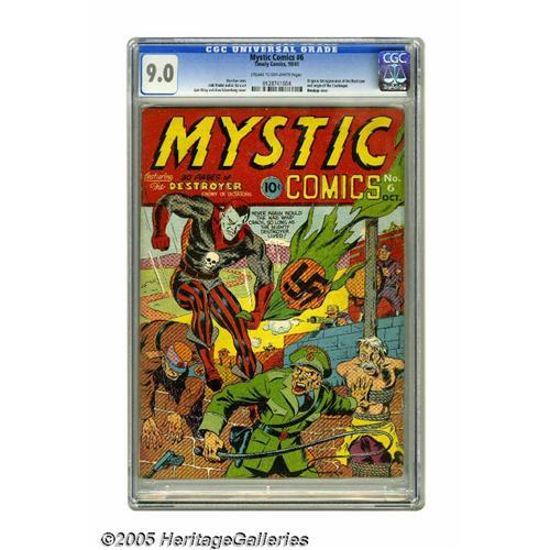 <B>Mystic Comics #6 (Timely, 1941) CGC VF/NM 9.0 Cream to off-white pages.</B></I> There hasn't been a better copy of this issue certified by CGC as of this writing! This issue has the origin and first appearance of the Destroyer, who was the only one of the top Timely characters created by Stan Lee -- he's been called Lee's most significant superhero creation prior to the Fantastic Four. Overstreet gives the cover the eyebrow-raising credit ""Kirby/Schomburg""... if this is really a collaboration between those two, it's remarkable indeed. Overstreet 2005 VF/NM 9.0 value = $3,982; NM- 9.2 value = $5,500. CGC census 9/05: 2 in 9.0, none higher. <I>From the Aviator Collection.</B></I> <BR><BR><B>Important notice:</B> Heritage usually auctions material at the rate of 200-250 lots per hour. On some occasions eBay Live bid software or the Internet may not be able to keep up with the pace of the auction. We recommend placing a realistic absentee bid now as insurance to avoid disappointment. Occasionally the auctioneer may eliminate or reject an eBay Live bid, and the auctioneer may also reopen a lot after the close of the eBay live bidding (usually because we missed an audience bid), and may reject your bid even if it shows you as the winning bidder. By bidding via eBay Live, you agree that Heritage may award the lot to another bidder at its sole discretion under the circumstances described above or any other reasonable circumstances. Since eBay bids are not shown to us until we open the lot on the floor, we treat those bids just like floor bids. In most cases the floor responds before the eBay bid is presented to us, due to Internet lag time, so for consistency we have made it a policy that floor bids are always considered first over tie eBay live bids. Also please note that all Heritage lots purchased through eBay Live carry a 20% Buyer's Premium. Please make sure you read the Terms and Conditions before you bid. This lot is being auctioned in conjunction with a live fl