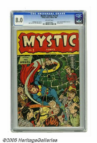 <B>Mystic Comics V2#3 (Timely, 1944) CGC VF 8.0 Off-white pages.</B></I> A great bondage cover starring the Angel is credited as a swipe from <B>Mystic</B></I> #1. Hey, if you're going to swipe, steal from your own! Artists include Al Bellman, Bob Powell, and Mike Sekowsky. This copy appears very sharp and attractive. Overstreet 2005 VF 8.0 value = $756. CGC census 7/05: 2 in 8.0, 1 higher.