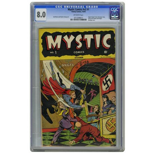 <B>Mystic Comics (second series) #1 (Timely, 1940) CGC VF 8.0 Off-white pages.</B></I> Since the Angel appeared on fewer covers than some other Timely stalwarts, here's a great chance to see him bust up a Nazi <I>Hauptquartier</B></I>. And did you notice the bondage scene featuring girl-on-girl interrogation? We thought so. Inside the comic, the Destroyer, the Human Torch, Terry Vance, and Tommy Tyme also appear. Overstreet 2006 VF 8.0 value = $1,619. CGC census 1/06: 1 in 8.0, 1 higher.