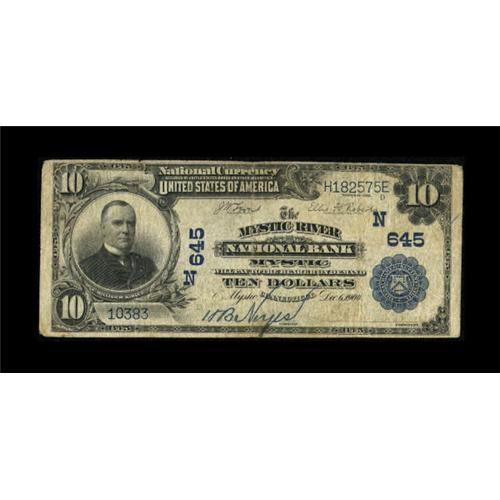 <B>Mystic River, CT</B></I> - $10 1902 Plain Back Fr. 624 <B>The Mystic River NB</B></I> Ch. # (N)645<BR> The penned signature of the cashier is very bold while the president's has faded. <BR><I>From The Kansas City Collection.</B></I><BR><BR><b>Shipping:</b> Coins & Currency (<a target="_blank" href="http://www.heritageauctions.com/common/shipping.php">view shipping information</a>)