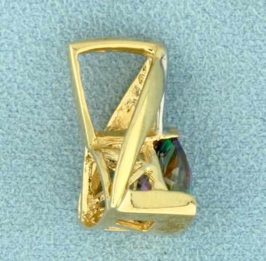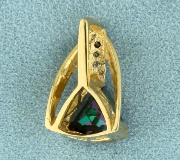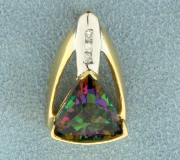 In 14k yellow and white gold. Containing a triangle shaped 10x10.5mm mystic topaz gemstone with brilliant colors. Bale has three .01ct high quality diamonds. 3/4" long. 4.5g.