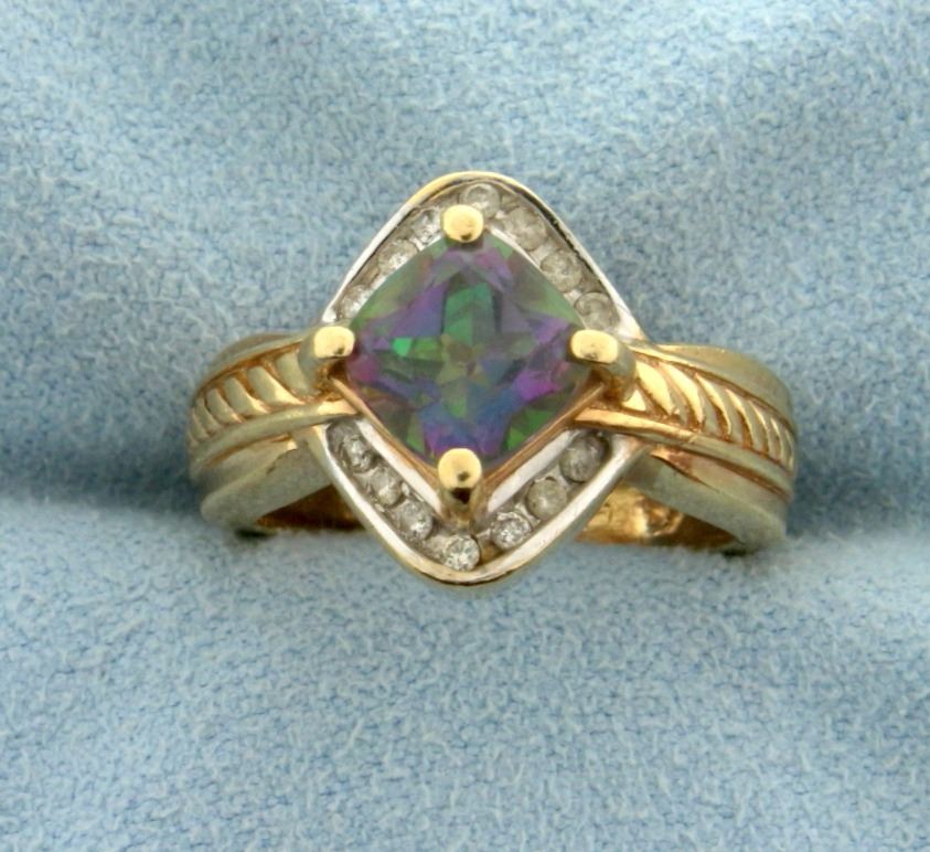 In 10k yellow gold, containing 2ct square mystic topaz gemstone surrounded by fourteen 0.01ct diamonds. Size 5. 5.1g.