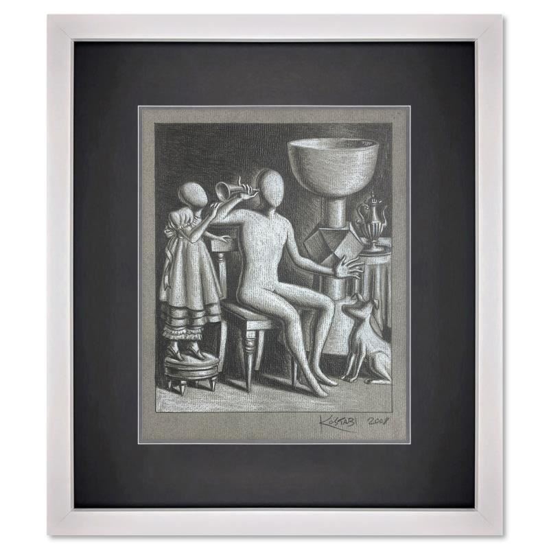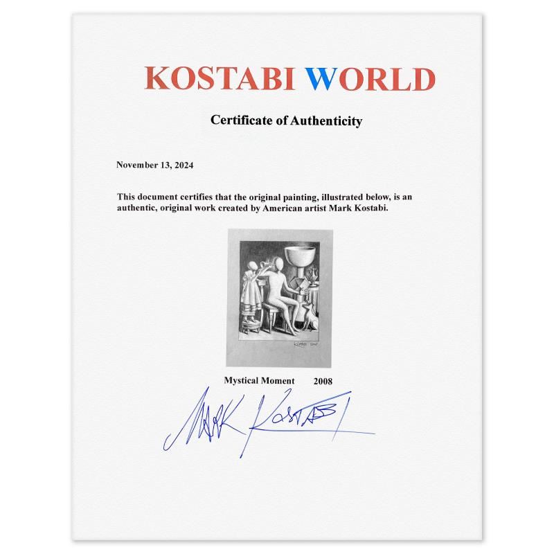 "Mystical Moment - New York" is an original drawing on paper by Mark Kostabi, hand signed by the artist. This piece comes custom framed. Includes Certificate of Authenticity. Measures approx. 16" x 13" (frame), 10" x 7" (image). This item requires special handling and may have a longer than usual turnaround.