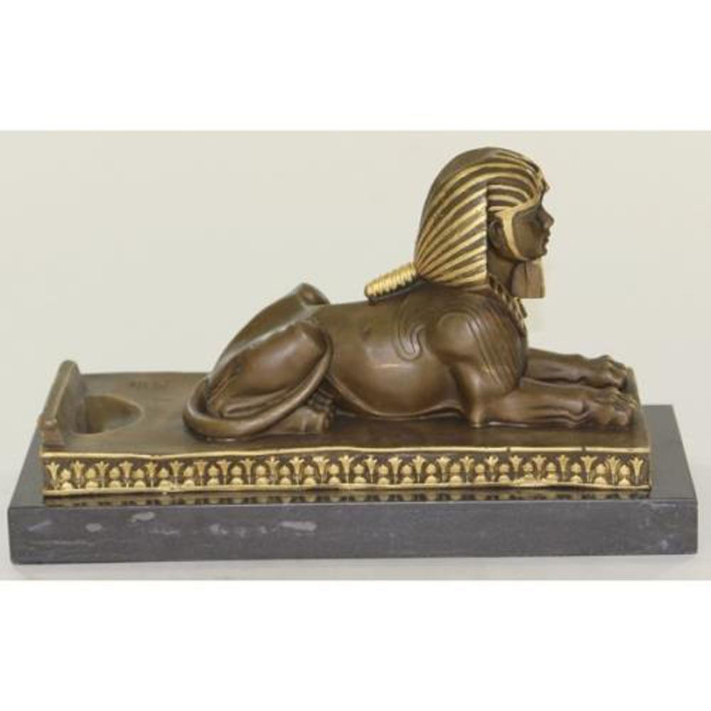 A sphinx is widely known mythological creature with a lion body and a human head. This image is highly revered in Egyptian and Greek art. The body is of a powerful and strong lion laying on its stomach with it is paws flat on the ground under his face. The detailed human head of the sphinx is adorned with a traditional Egyptian headdress. The body is on a beautifully decorated platform. The bronze sculpture rests on a marble base. The piece was crafted using the lost wax method. Bronze Dimensions with Marble Base: Height 8 X Width 13 Inches. Weight: 16 LBS.