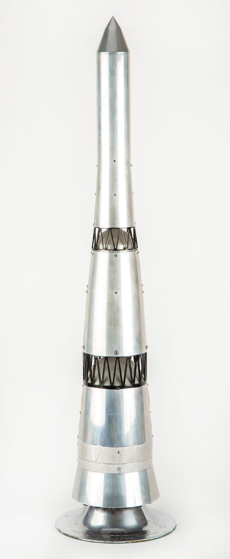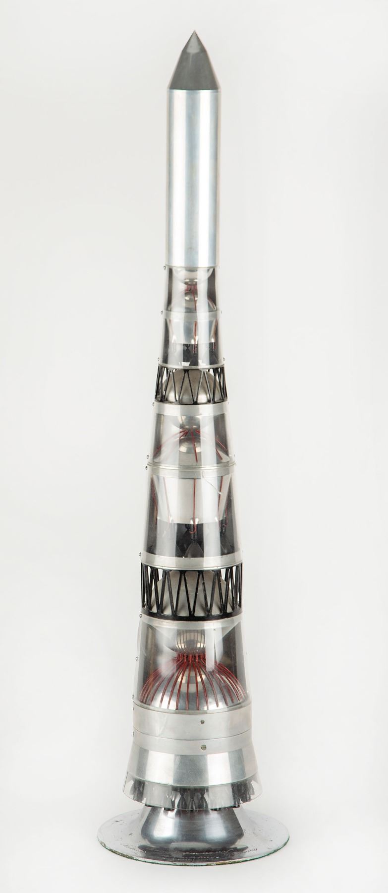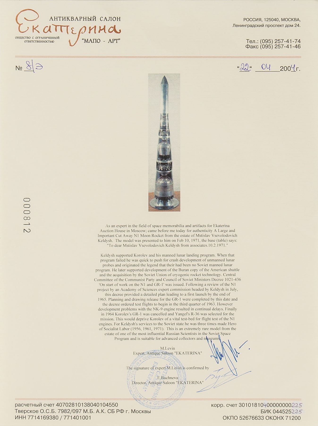 Stunning cutaway model of the N1 moon rocket, a super heavy-lift launch vehicle that served as the Soviet rival to NASA’s Saturn V and was intended to enable crewed travel to Earth's Moon and beyond. Constructed of sundry parts metal and plastic, the model stands a lofty 24.5˝ in height and is set upon a metallic base 6˝ in diameter, which bears an engraved Cyrillic inscription (translated), “To dear Mstislav Vsevolodovich Keldysh from associates, 10. 2. 1971.” In fine condition, with some scuffing and wear to base and metal panels, and a small crack to middle plastic cut-section window. Accompanied by a certificate of authenticity.