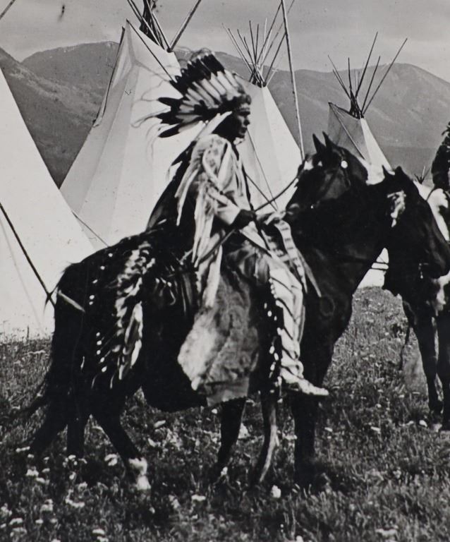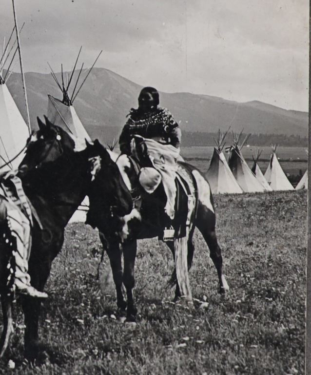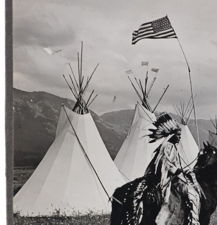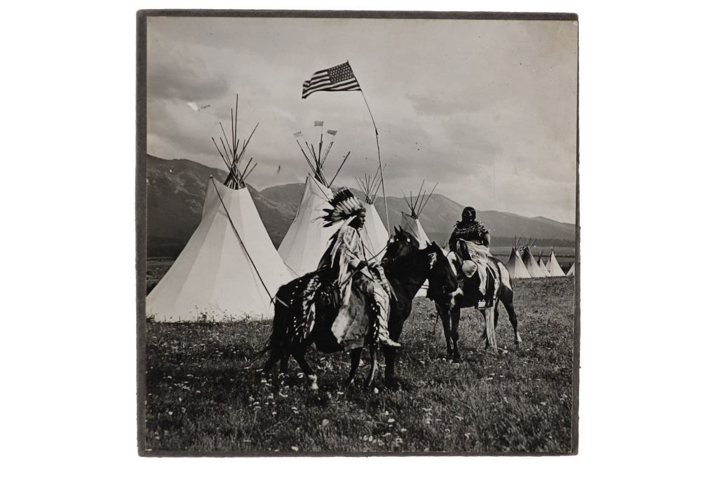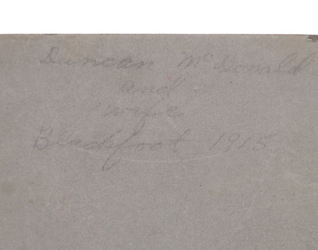 The lot features an original image of Montana Flathead Duncan McDonald with his wife amongst tepees taken by Norman A. Forsyth (1869-1949) of Butte, Montana from circa early 1900. Duncan McDonald was born at the Fort Connah Trading Post on Montana's Flathead Reservation (Salish) in 1849 to a Nez Perce (Niimíipuu) mother and a Scottish father. His dual ancestry would play a significant role in his life, as he often served as a liaison between tribal communities and white settlers and the government. His father is noted as the first Hudson Bay fur trader in Montana. The photo was taken by N.A Forsyth / Norman A. Forsyth (1869-1949), a photographer who operated a studio out of Butte, Montana from 1904-1930 working for Underwood and Underwood and later Keystone View Company. Most of his work is displayed in stereograph viewer and portrait cabinet card form. He was known for his unique views of Glacier and Yellowstone National Parks; Butte, Montana; and Montana Indian Tribes. The photo shows McDonald on horse back wearing a large feather headdress as his wife sits on horse back near him. The Mission Mountains can be seen in the background and a long row of teepees can be seen. This was taken near Flathead Lake. The photo is marked on the back in pencil reading, "Duncan McDonald and Wife / Blackfot 1915". It shows good condition overall with little to no wear present and no signs of damage is noted. It measures 3 1/4" L x 3 1/4" W and weighs under 6 ounces.