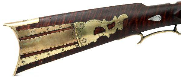 Full stock .44 caliber percussion Kentucky rifle, with double set trigger. Tiger maple stock, with metal fish shaped inlay, brass trigger guard, butt plate, and patch box. Lock Marked "N. Ashmore". Possibly a 19th Century conversion from flintlock to percussion. N. Ashmore is the name of a 19th Century flint and percussion lock maker in Lancaster County, PA. Stock is in good condition, with minor crack towards muzzle and one loose brass ramrod band, but no other damage or repairs. Lock does not appear functioning, but appears repairable. Caliber: .44