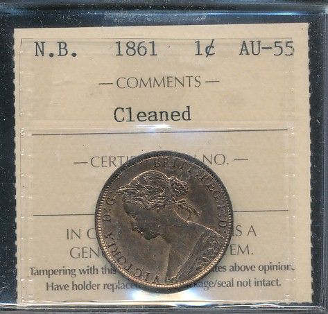 N.B. 1861 1¢ ICCS AU55. Designated as cleaned.