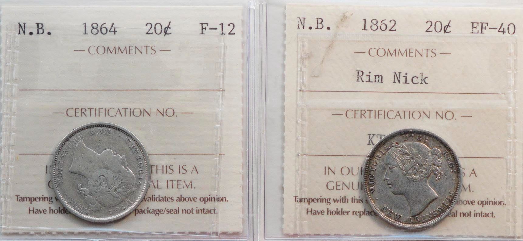 N.B; 1862 20¢ "Rim Nick", 1864. Lot of 2 coins ICCS Fine-12 to Extra Fine-40