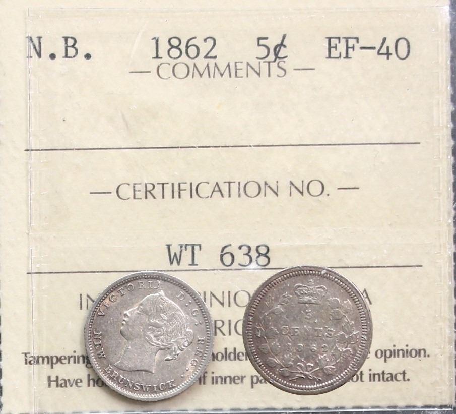 N.B. 1862 5¢ ICCS Extra Fine-40, Lustrous example. A nice coin.