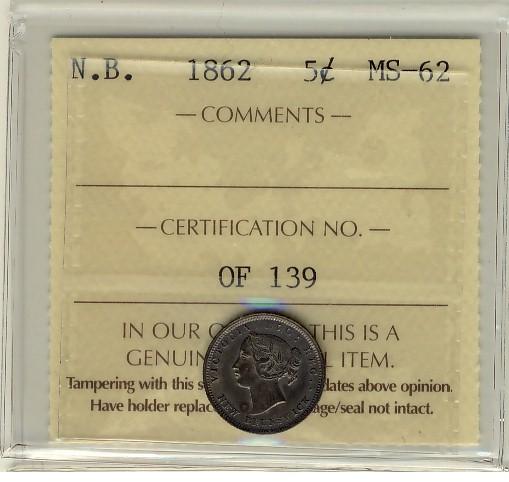 N.B. 1862 5¢ ICCS MS62 lightly toned. Rare this nice.