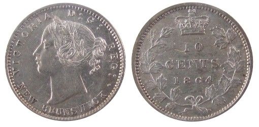 N.B. 1864 10¢ ICCS AU50. Lustrous. Seldom offered.