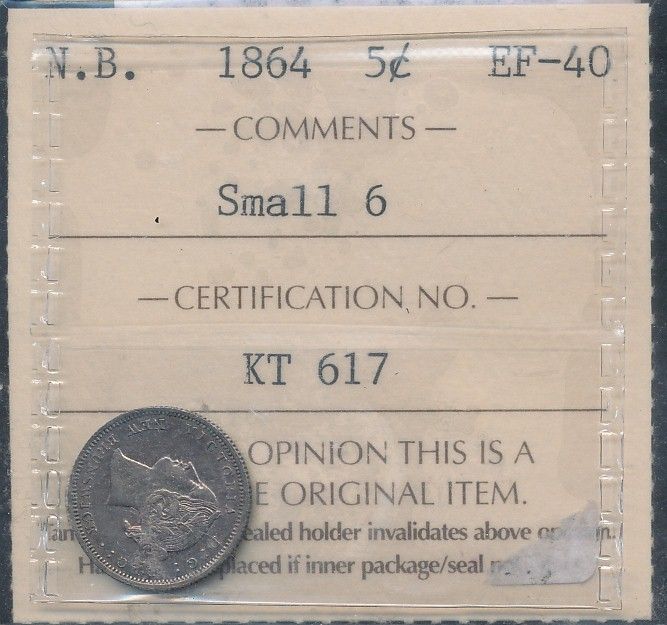 N.B. 1864 5¢ Sml 6 ICCS EF40. More intense gold shade.