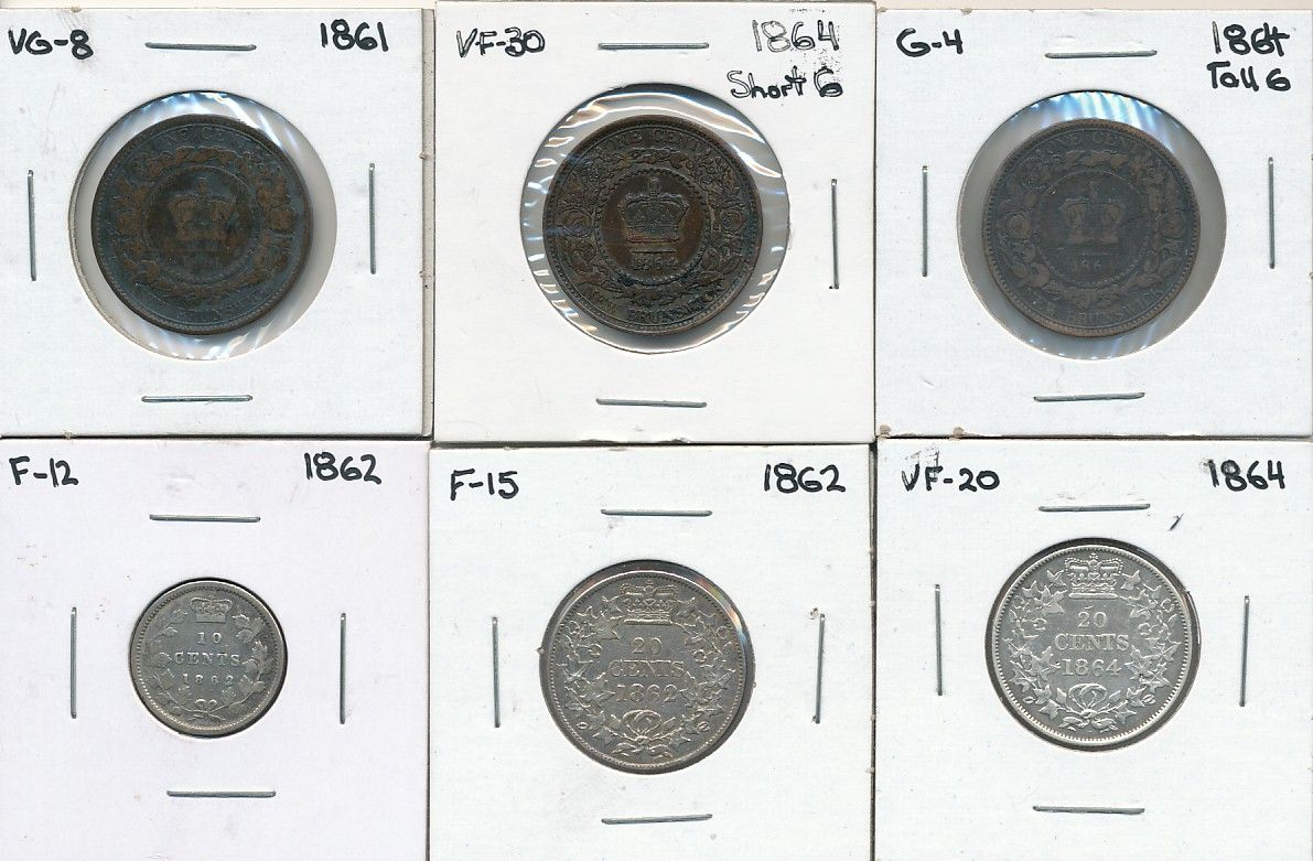 N.B. Lot; includes 1861 1¢, 1864 Short and Long, 1862 10¢, 1862 20¢ & 1864. Lot of 6 coins Good to F+.