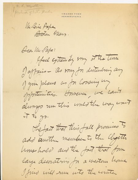 (1882 -1945) Renowned American illustrator and artist who created some of the most recognizable images of his time, the father of painter Andrew Wyeth. Fine and rare A.L.S. 2pp. 4to., Chadds Ford, [n.d. but ca. 1909], on his imprinted letterhead to his teacher and fellow artist Eric Pape, in part: "...Extremely sorry at the turn of affairs. As sorry for disturbing any of your plans as for losing any opportunities. The fact that this fall promises to add another member to the Wyeth household and the fact that four large decorations for a western home I find will run into the winter makes it impossible to undertake that stupendous job of moving to Boston. The former matter is enough in itself...I earnestly hope that you are not too badly inconvenienced and trust that I am not saying too much by adding, that I hope the future will see satisfactory arrangements carried out...". Eric Pape (1870-1938) was a renowned painter who taught illustration at his eponymous school in Boston and enjoyed Wyeth as one of his first pupils. He routinely produced illustrations for magazines such as Scribners, Cosmopolitan and The Century. Later, Wyeth considered teaching at the Eric Pape School but ultimately declined, perhaps for the very reasons outlined in this letter. Light toning to edges, rusted paperclip impression at top left, overall very good condition.