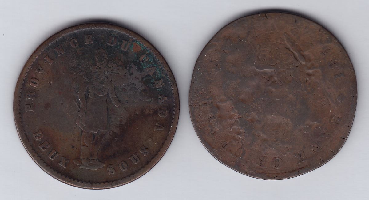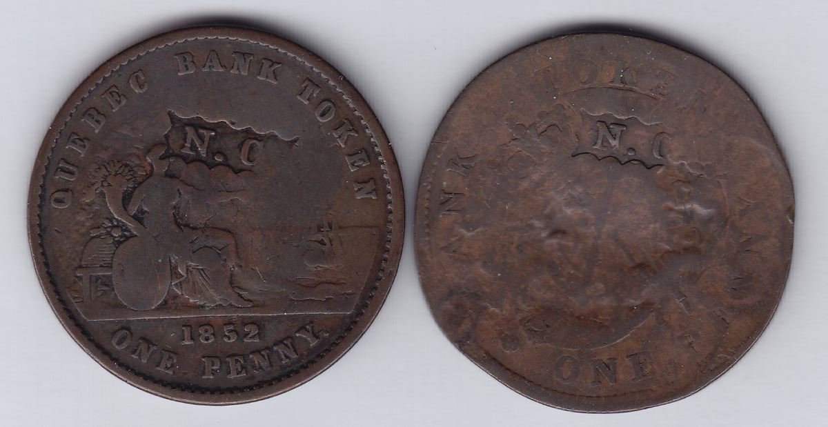 N.C within serrated cartouche on rev. of Quebec Bank penny, 1852, Br 528 (M.I. 679); on rev. of Bank of Upper Canada penny, 1857, Br 719 (M.I. 680). 2 Pcs.
