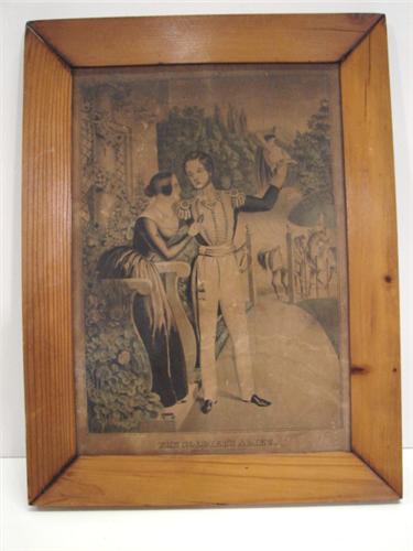 N. CURRIER EARLY 19TH CENTURY SOLDIER PRINT. Titled "The Soldier's Adieu". Depicts an early 19th century soldier departing his wife. In pine frame. Shows a large amount of soiling at top and fading throughout. 12.5" x 16.5" framed.