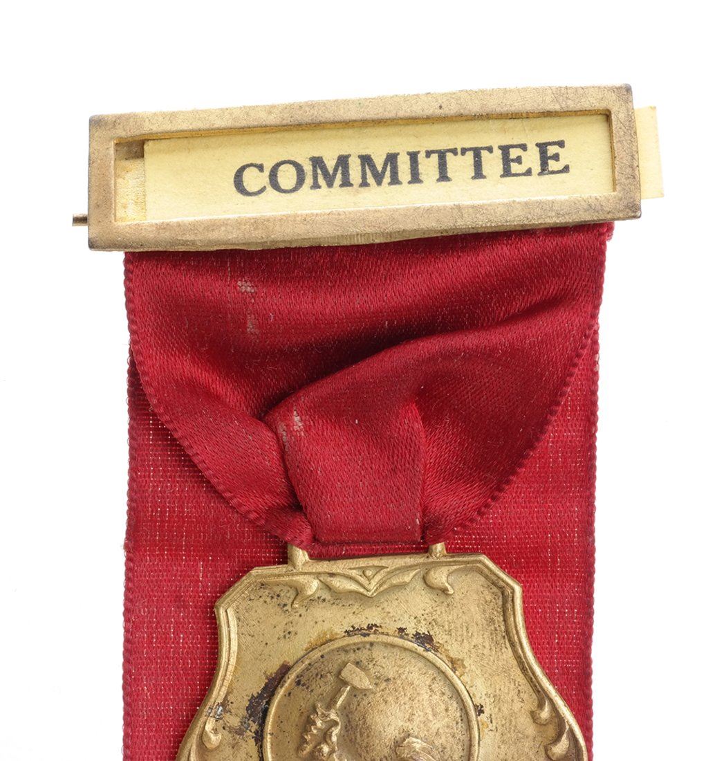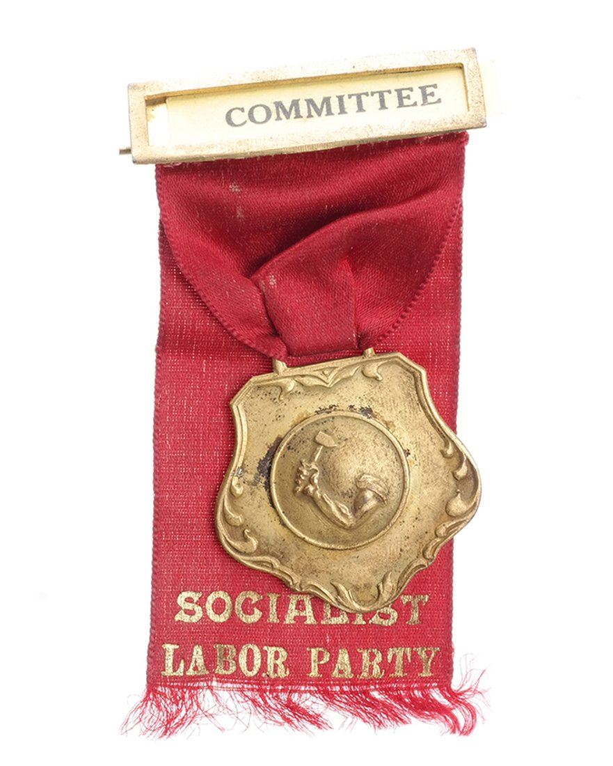 Goldplate, 34.2mm, red gold-stamped ribbon, celluloid "COMMITTEE" pinback header. SLP, originally known as the working man's party, was a far-Left party brought to prominence by Daniel DeLeon.
