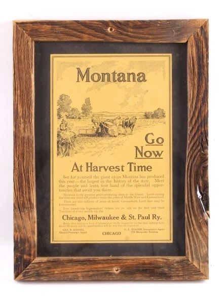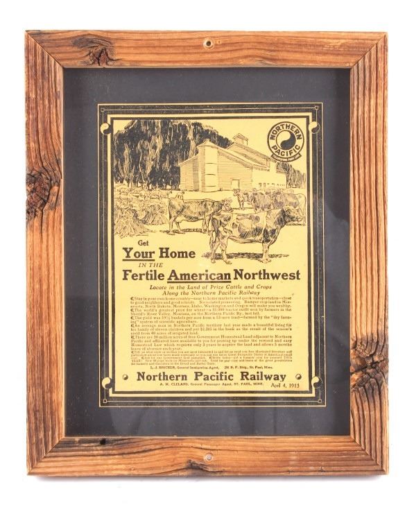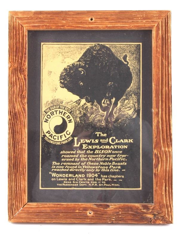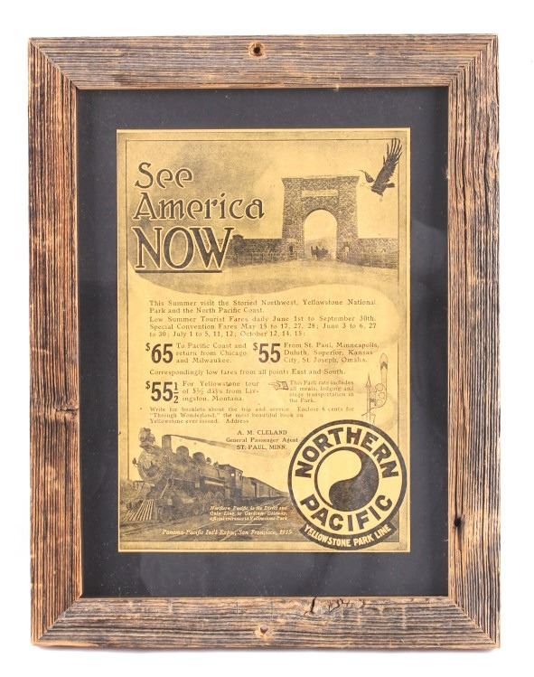 This is a collection of four Yellowstone National Park advertisements from the Northern Pacific Railway. Each one features images and information on train travel to the park. They are framed in rustic wooden frames. The advertisements are in good condition. The frames measure 10.25" x 13.5".