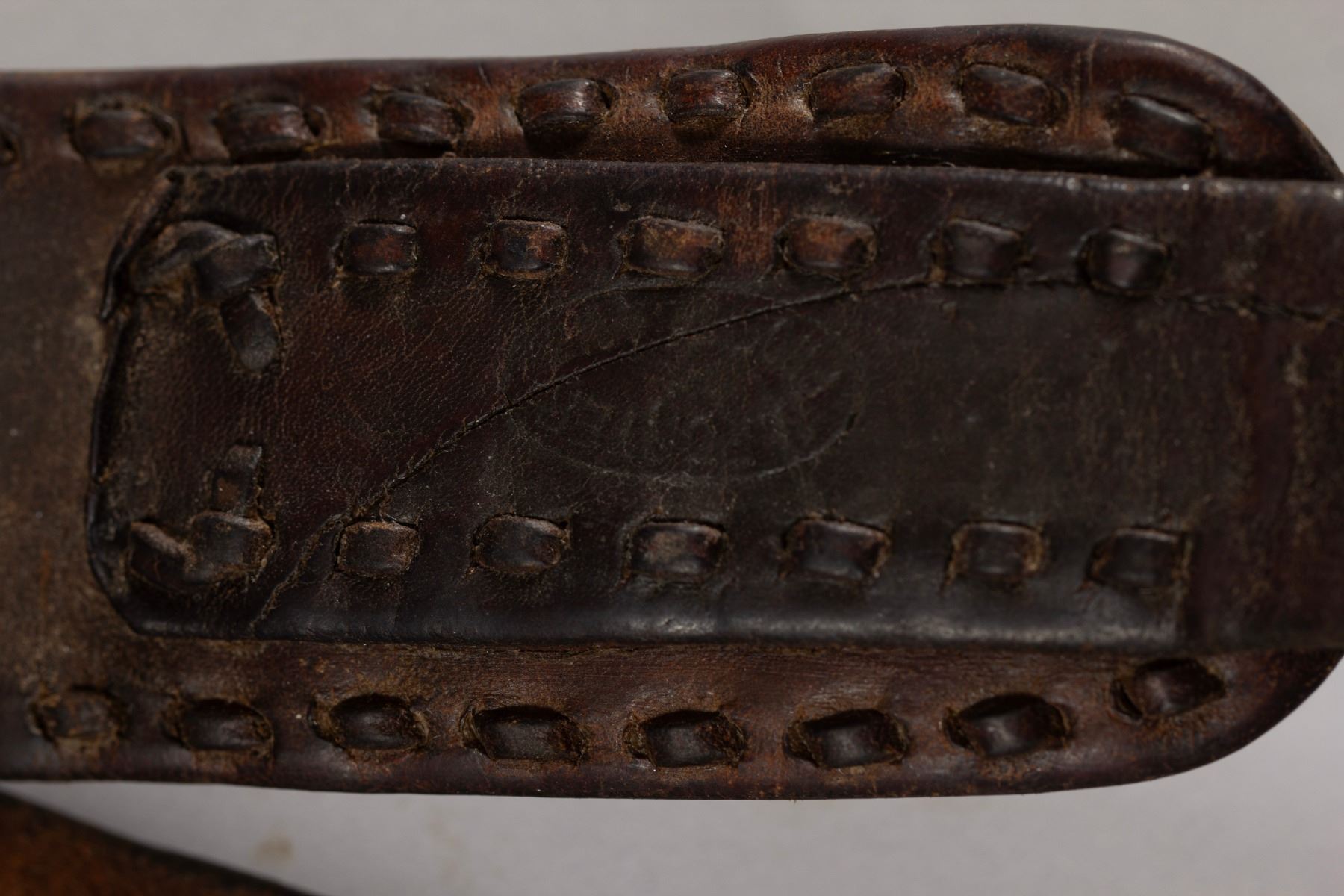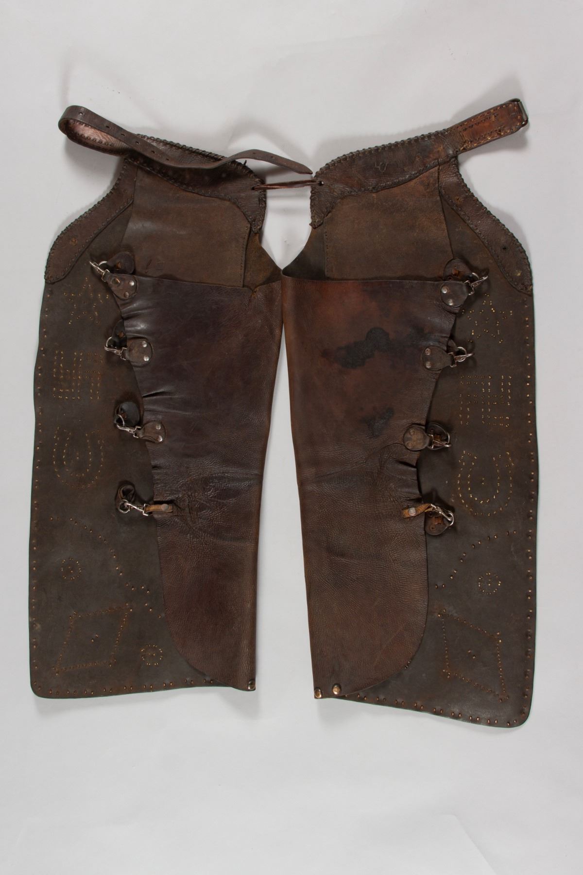 Stunning marked "N. PORTER" Lucky design batwing chaps. Belt 48" Length end to end, 37.5"L; Original conchos with studded stars, whirrling log, horseshoe and diamonds. Great condition. Newton Porter started his business in Taylor, Texas in 1875 and moved to Phoenix, AZ in 1895, where he established the N. Porter Saddle & Harness Company. 34" L