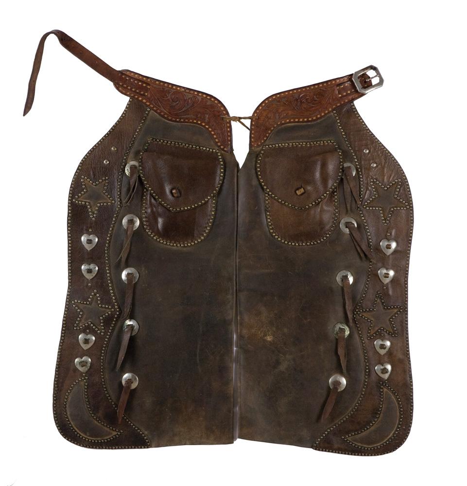 Overall with studded and cutout stars and crescent moons. Heart conchos on wings with 5 round conchos down each leg. Outside pockets, well maker-marked and in very good overall condition.