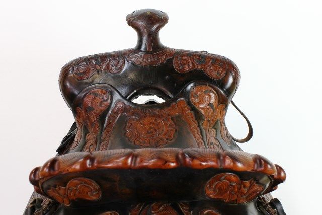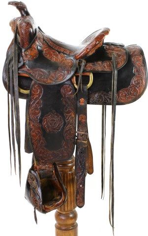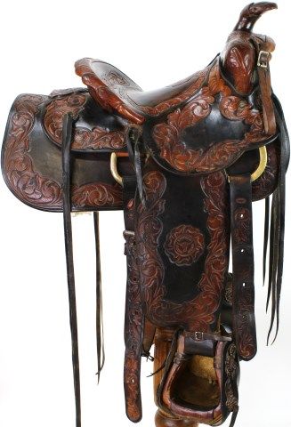 two tone black and brown, deep floral carving, stamped on fenders and cinch strap holder. Remains very good to near fine condition, 12 1/2" seat, original lining, stirrup covers and strings. Est. 850-1500