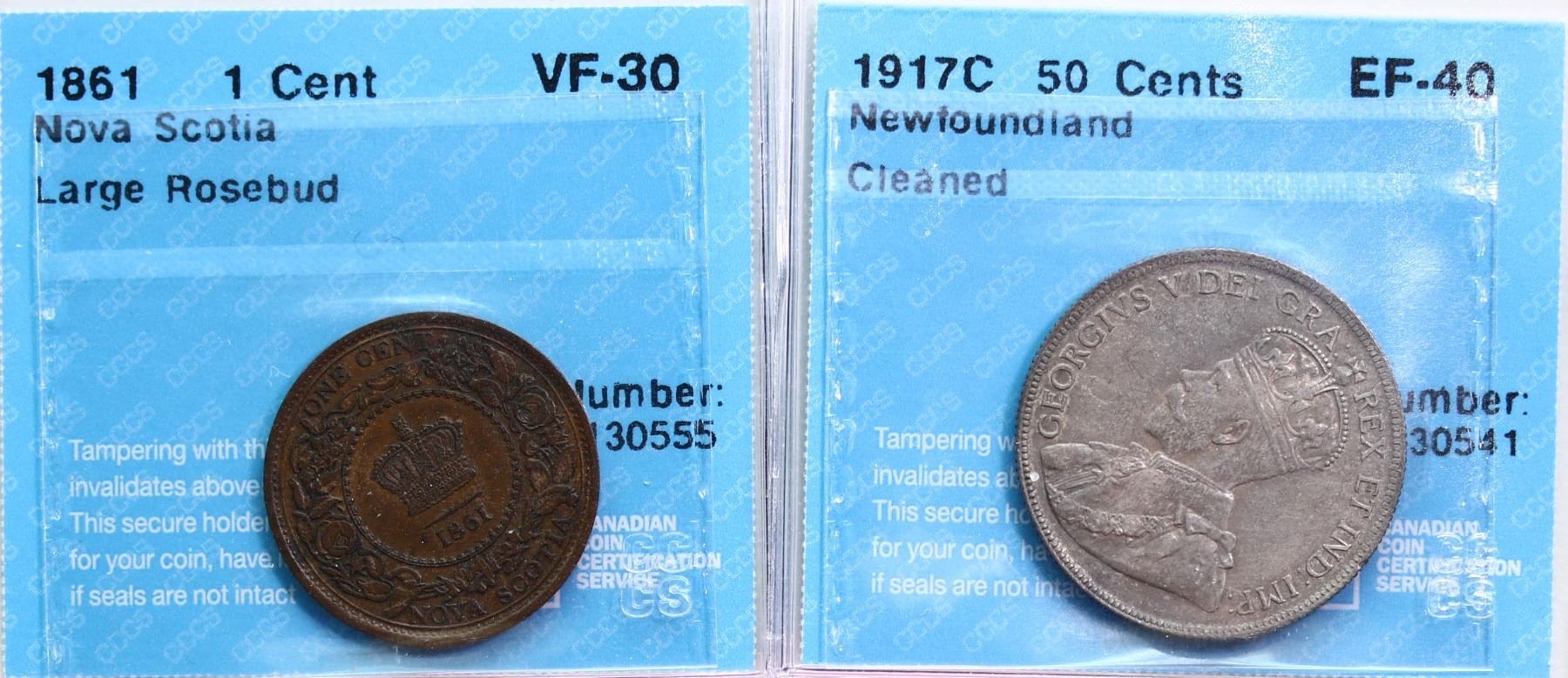 N.S. 1861 1¢ "Lg Rosebud", Nfld 1917C 50¢ Both coins CCCS Choice Very Fine-30 & Extra Fine-40 respectively.