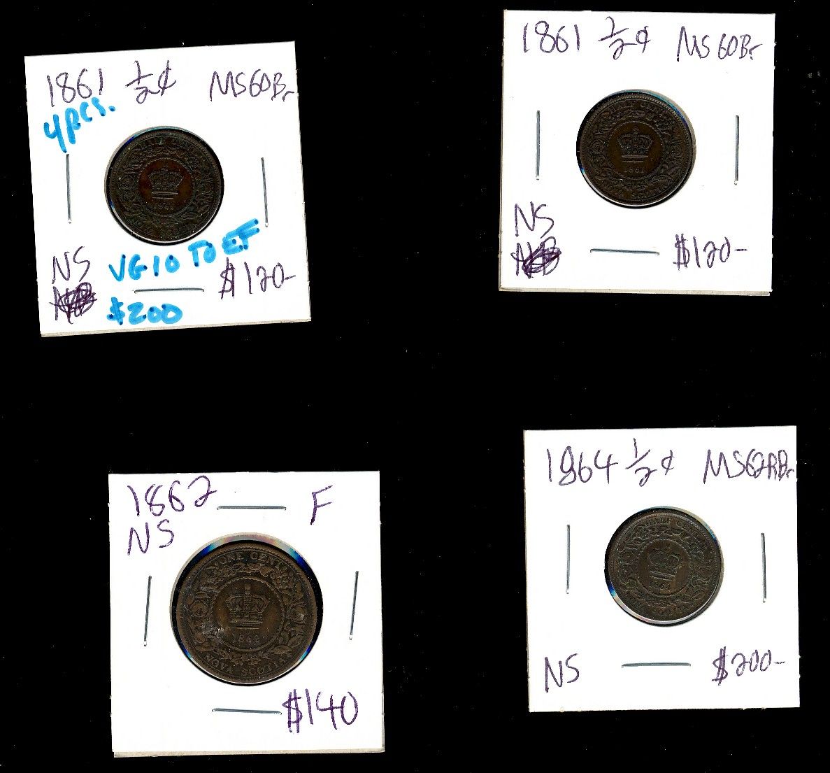 N.S. 1861(2) ½¢, 1864 ½¢ & 1862 1¢. Lot of 4 coins VG to EF.