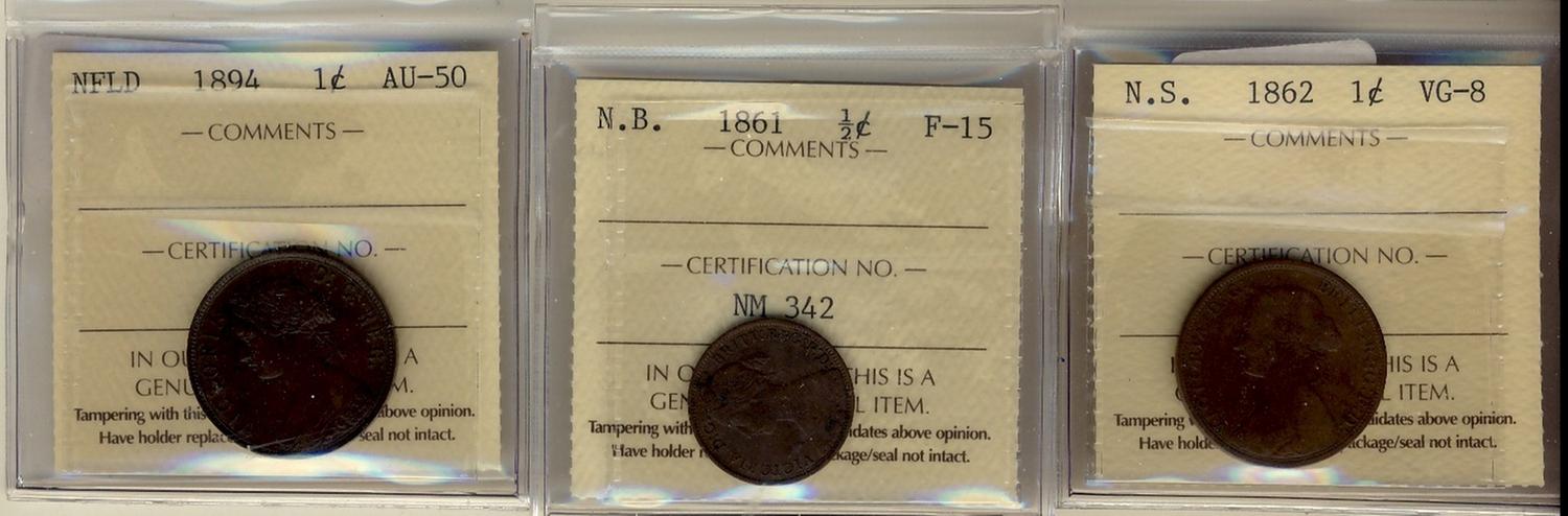 N.S. 1862 1¢ ICCS VG8 1861 NB 1/2¢ ICCS F15 1894 NFLD 1¢ ICCS AU50 Lot of 3 coins
