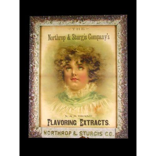 The Northrup and Sturgis Company N and S Brand Flavoring Extracts Paper Sign, in original Gesso frame. Some overall discoloration to sign and chips on frame otherwise very good condition. 18 1/2 X 23 1/2 inches.