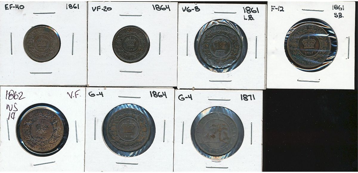 N.S. Lot; includes 1861, 1864 ½¢, 1861 1¢ LB, SB, 1862 & 1864, along with PEI 1871 1¢. Lot of 7 coins Fine to EF.