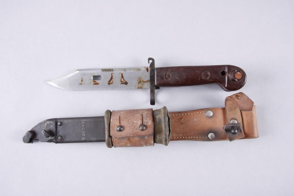 N Viet Namese Army Machine Gun Bayonet & ScabbardNVA Viet Cong AK 47, both are marked "S BX 3433" and includes the brown leather belt frog, blade measures 6" with overall length of 13".
