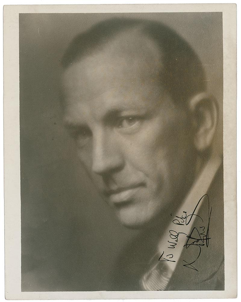 Vintage pearl-finish 8 x 10 close-up portrait, signed and inscribed in fountain pen “To Wally Pike, Noel Coward.” In fine condition, with some creasing across his forehead and light mottled staining to the left side of his face.