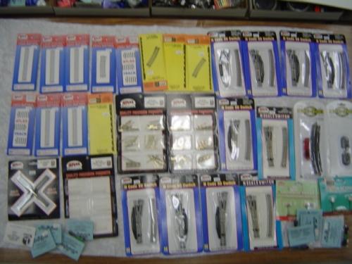 Atlas 5- 2538 Plastic rail joiners (24pc), 12 2535 Metal Rail joiners (48 pc), 2-2521 1/2 - 11" Radius 6 pc, 2567 45 degree crossing, 2568 60 degree crossing,2511 1/2 93/4 radius track 6 pc, 2- 2532 Rerailer 3 pc, 5-2501 5" straight 6 pc, 2569 90 degree ,2750 Standard Left Switch Right, 9-2539 Terminal Joiners, 3- 2702 Standard Left Manual, 2707 Standard #6 Turnout manual right, 2706 Standard #6 Turnout Manual Left, 3- 2703 Standard Right Manual, Model Power 8578 Road Scenes 2 Gulf Sighs, 8579 Road Sign, 2 Exxon Signs, Bachmann 44890 EZ Track N Bumper 2 pc, 44802 EZ Track 11 3/4 Terminal Track
