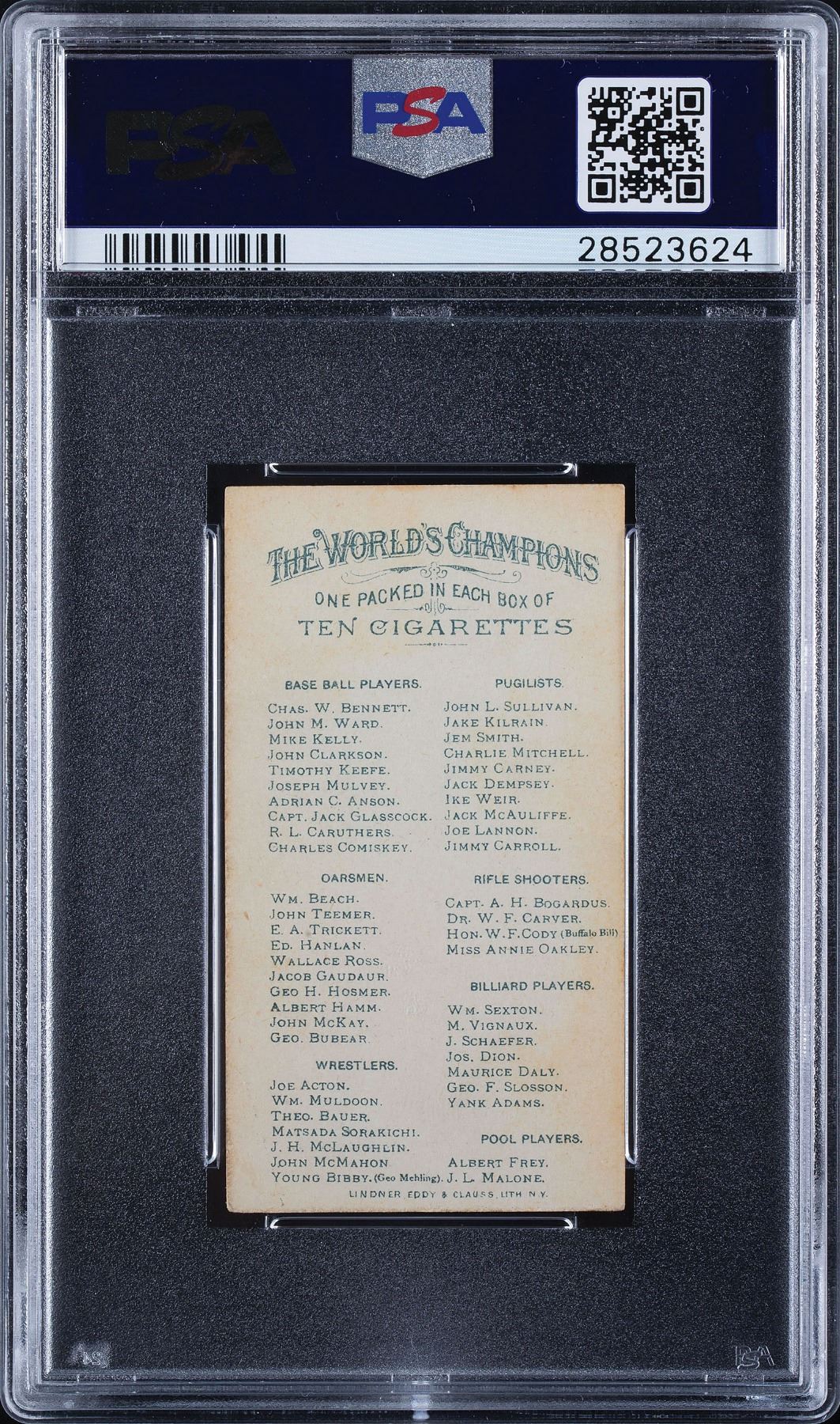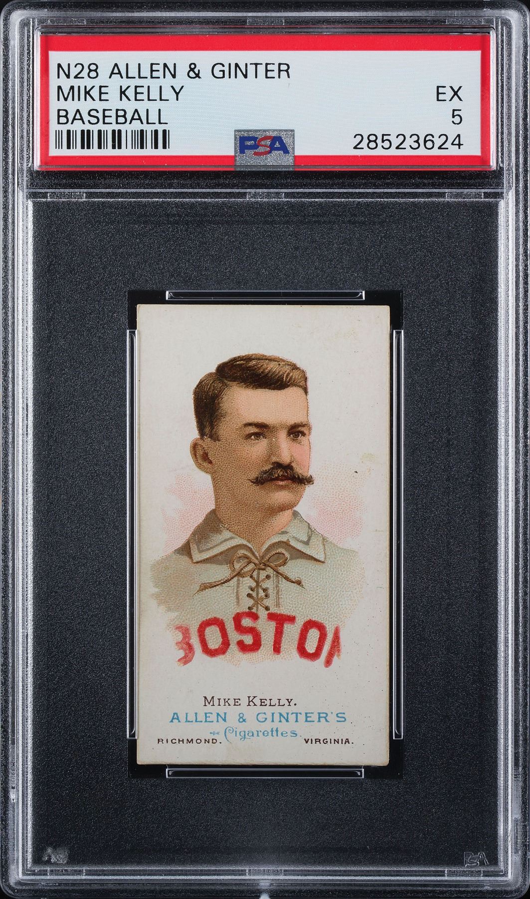 Graded by PSA EX 5. Another very clean example of an Allen & Ginter card, this time of the first baseball superstar Mike 'King' Kelly. Four strong corners with light reverse toning. No one could complain if this card was evaluated at a full grade higher. PSA is very harsh on these 19th century pieces of artwork.