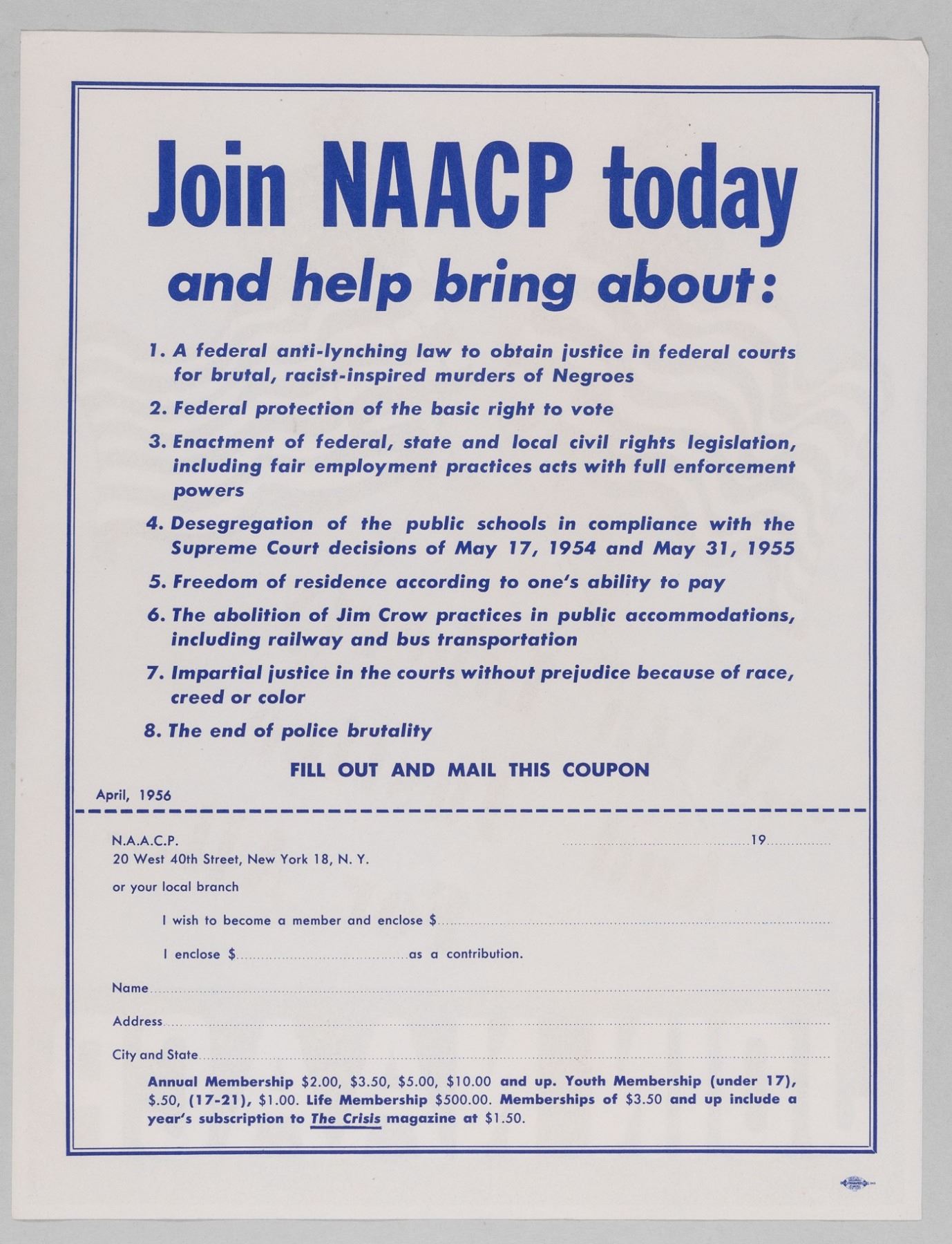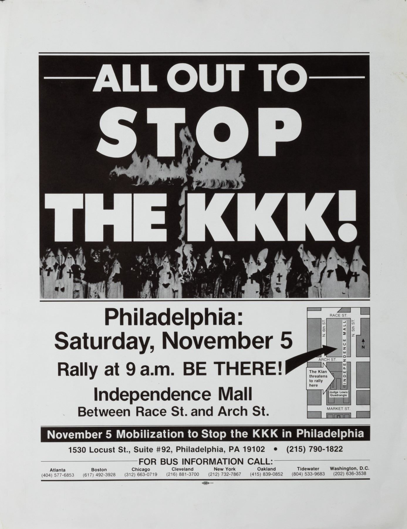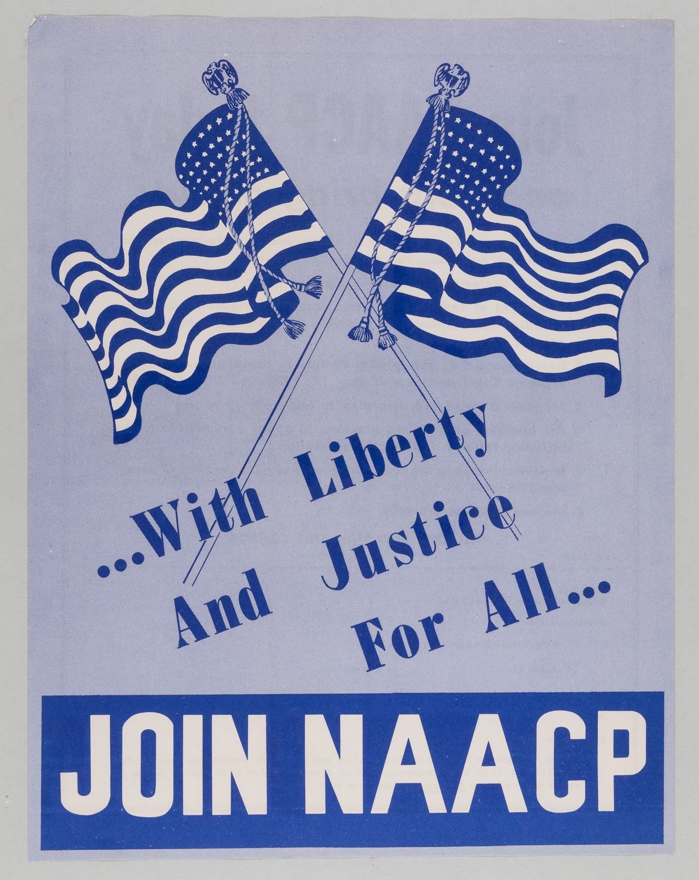 Two protest posters, published by the NAACP and a Philadelphia rally group. The NAACP flyer bears two American flag illustrations with the text, '...With Liberty And Justice For All...' on the obverse. The reverse lists reasons to join the NAACP. 11 x 8.25 inches. The second poster advertises a protest rally at Independence Hall in Philadelphia, 26.25 x 20 inches. Minor pinhole marks at corners of Philadelphia poster.