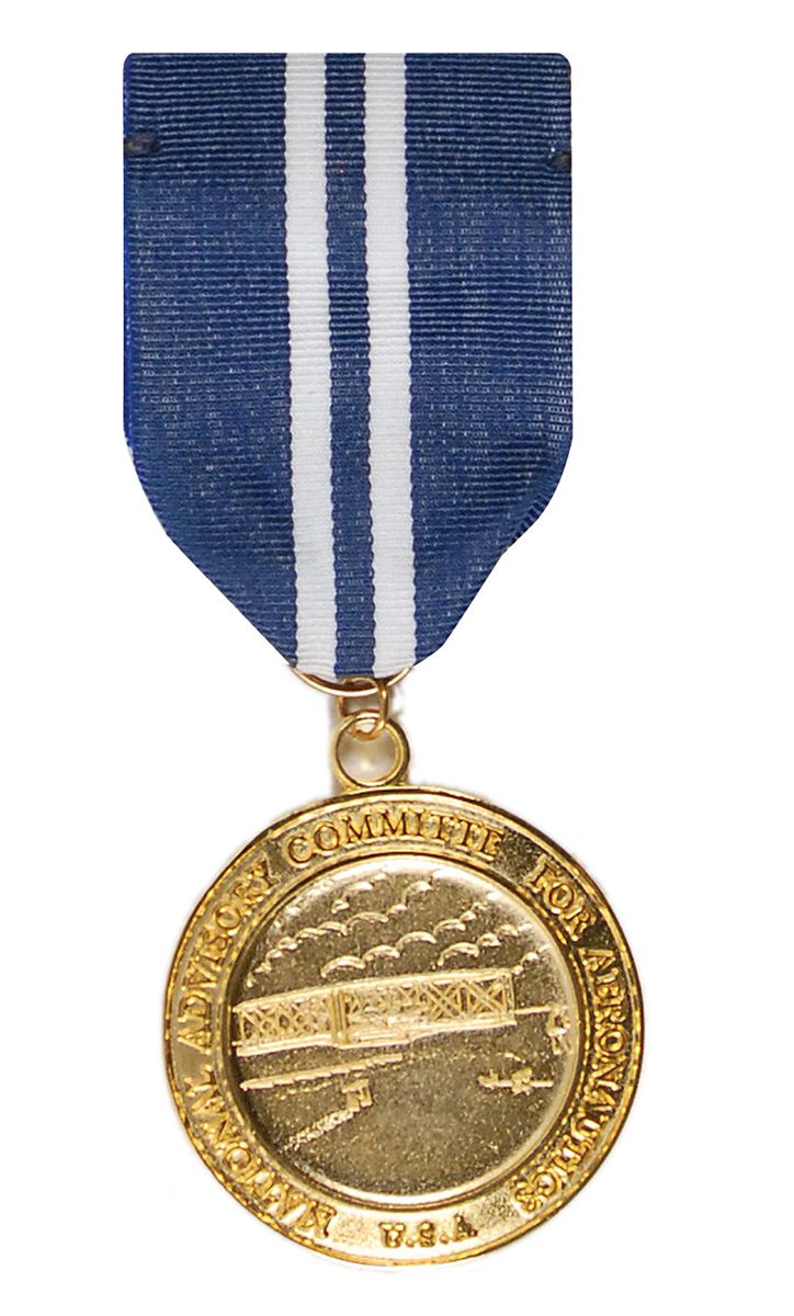 National Advisory Committee for Aeronautics gold-colored medal for distinguished service. Award consists of a blue and white ribbon with a 1.5? medallion at the end, featuring a raised relief of the Wright brothers’ first flight in the center and the words “Distinguished Service” on the reverse. In fine condition.