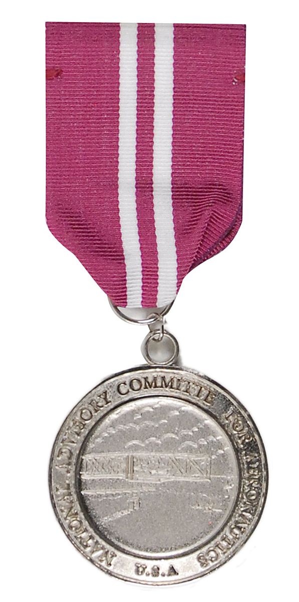 National Advisory Committee for Aeronautics silver-colored medal for exceptional service. Award consists of a magenta and white ribbon with a 1.5? medallion at the end, featuring a raised relief of the Wright brothers’ first flight in the center and the words “Exceptional Service” on the reverse. In fine condition.