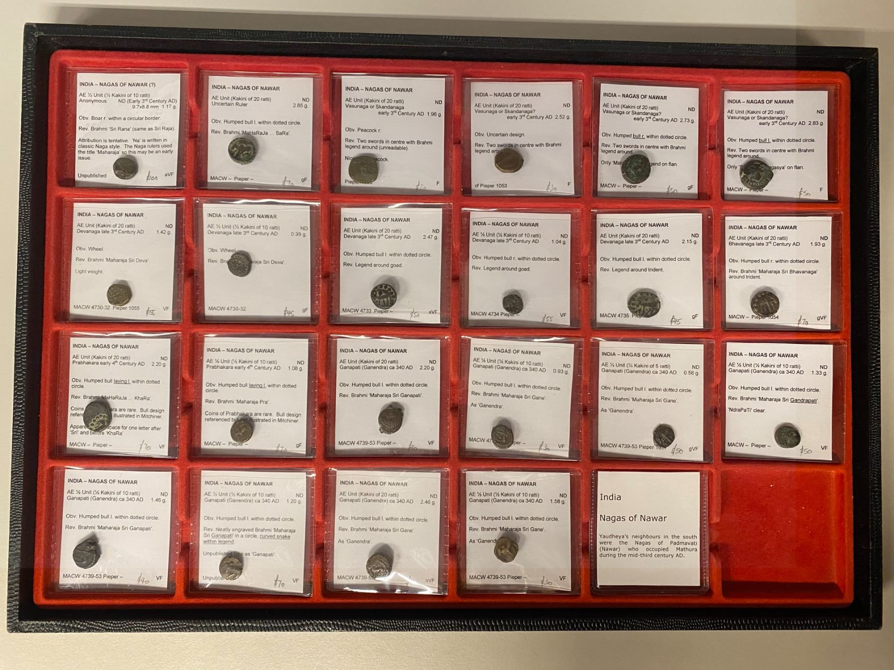 NAGAS OF NARWAR: LOT of 22 copper coins, inclluding issues of the following rulers (3rd-4th century AD): Vasunaga or Skandanaga (4 pcs), Devanaga (5), Bhavanaga (1), Prabhakara (2), and Ganapati (8), also Anonymous (1) and uncertain ruler (1), of whch only Ganapati is truly common; early rulers mostly Fine, Ganapati VF or slightly better; all with Todd's description; retail value $400, lot of 22 pieces, ex Ian Todd Collection.