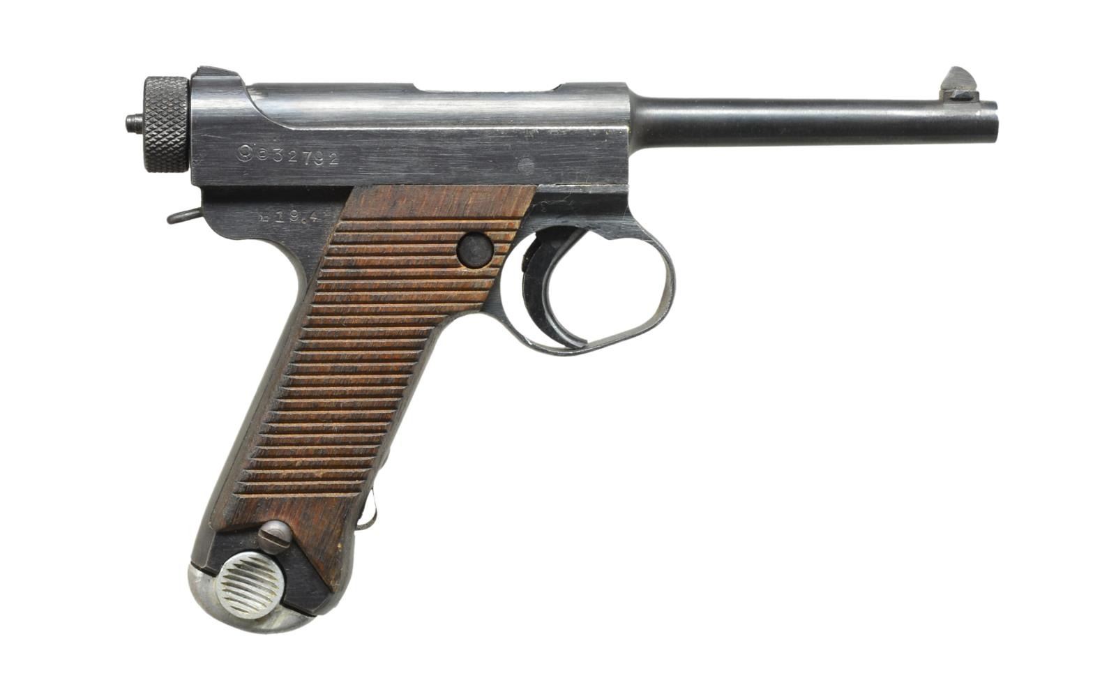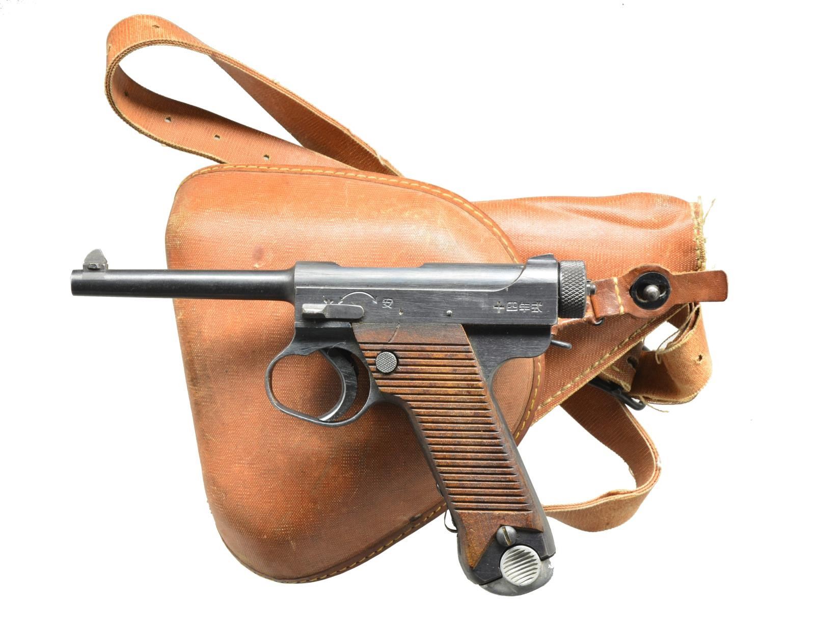 Cal. 8mm Nambu. S# 32792. Bbl. 4.7". Mfg. April 1944 w/ grooved hardwood grips & lg. trigger guard. Matching numbers visible on trigger, bolt & solid knurled cocking piece. MAGS: 2 very good 8 rd. w/ aluminum bases; S# 311 & 286. UNATTACHED ACCESSORIES: very good to excellent molded clamshell holster w/ spare firing pin & cleaning rod. Attached shoulder strap has some areas of delamination but overall good to very good. 1 Japanese character inked under flap. Original Senator Brewster paperwork to be included; former U.S. Senator from Maine who once owned this pistol. CONDITION: typical safety lever mark extending onto grip. Some very slight high point wear on receiver & edges of muzzle. Very slight function wear visible at rear sight area. Balance of pistol near excellent w/ bolt face having unfired appearance. Near excellent bore & grips. (20-3005/NW). CURIO. $650-900.