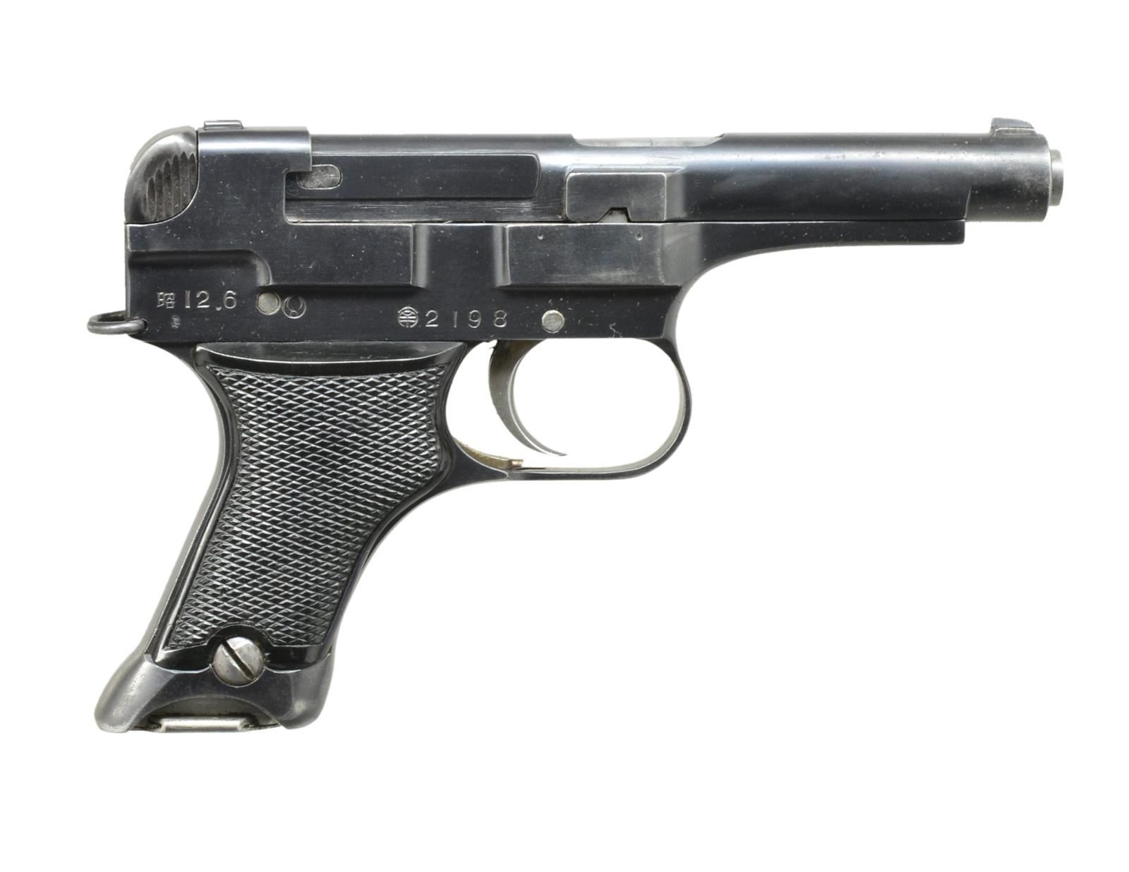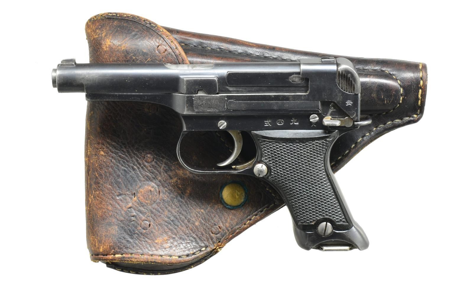 Cal. 8mm Nambu. S# 2198. Bbl. 3.8". Mfg. June 1937 (1935-1945; 70,000 units). Numerous Japanese characters & checkered black plastic grips. Trigger & hammer pivot screws have abbreviated heads rather than more common flush heads. MAGS: 2 good 6 rd.: 1 w/ matching numbered plated w/ flat base & 1 blued #528 w/ ribbed base. UNATTACHED ACCESSORIES: pig skin flap holster w/ snap retention & what appears to be markings from prior decorative metal disks that were attached to front & end of flap. Blued cleaning rod. CONDITION: very good appearance w/ some faint high point wear & light peppery oxidation. Very good grips & bore. Breech face exhibits minimal use. Good but faded straw colors. (20-3301/NW). CURIO. $700-1,000.