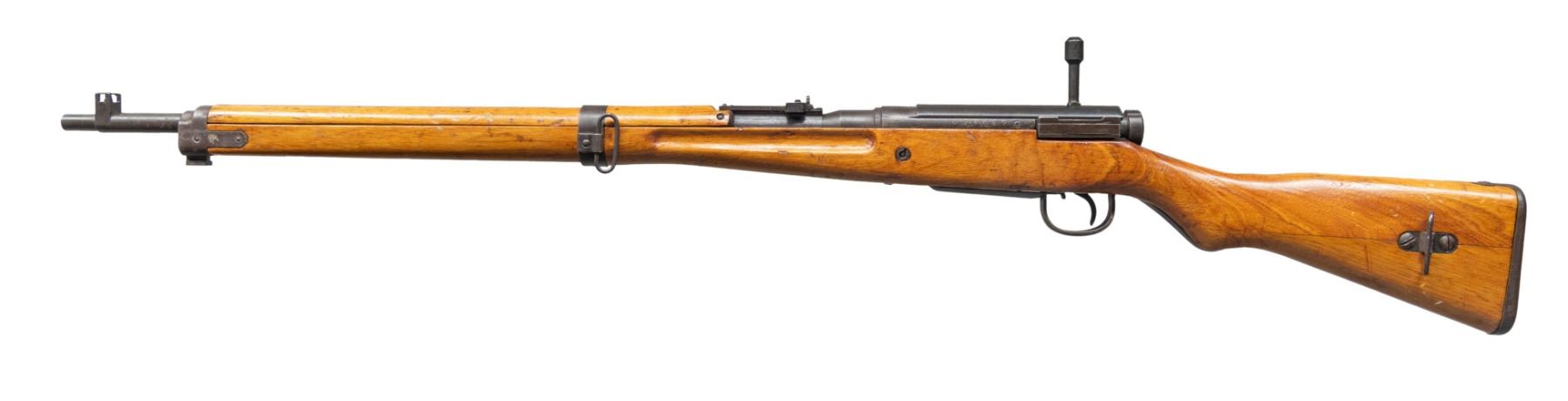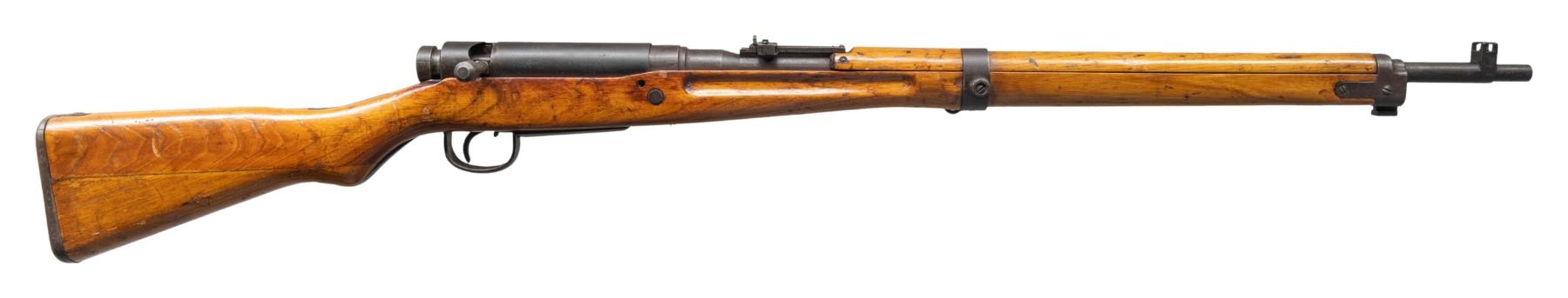 Cal. 7.7 Jap. S# 77654. Bbl. 25 7/8". Blade front sight with protective ears. Ladder aperture rear sight graduated to 1500m without AA wings or provisions. Safety & dust cover are mismatched but all other parts are matching to receiver. Receiver top has fully intact mum & Type 99 markings. Left side of receiver has serial number, 6th series & Nagoya markings. Blued finish. Asian hardwood stock with left side sling swivels. Cleaning rod & cleaning rod button assembly both missing. CONDITION: refinished stock has added varnish with metal being proud of wood in some places, scattered dings, handling marks & wear. Metal shows overall fading with strong traces of arsenal blue, overall oxidation, some handling marks & edge wear. Action functions properly when hand cycled. Very good plus bright bore. (25-3953/MJC). CURIO. $300-500.