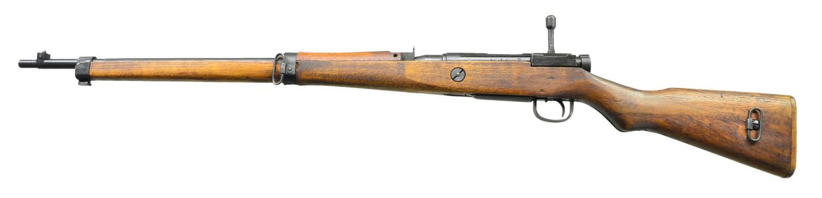 Cal. 7.7 Jap. S #21728. Bbl. 25 1/2". All matching numbers. Top of receiver has intact mum. Left side of receiver marked w/ 11th series marking, Nagoya symbol & serial number.. Fixed aperture rear sight. Inverted V front sight w/out protective ears. Left side sling swivels. Bayonet lug has welded construction. Three nail wooden buttplate. Hardwood stock w/ two piece construction & short handguard. Forend made in 2 pieces; separate & loose between bands. Left side of butt has "REED" carved into it & bottom of wrist has strong Nagoya proofs. CONDITION: hardwood stock set shows scattered handling marks, light scratches & some dings. Metal retains 85% original blue w/ some light dings on right side of rear band, wear on bottom metal & scattered fading. Very good bright bore. (22-681/MJC). CURIO. $200-400.