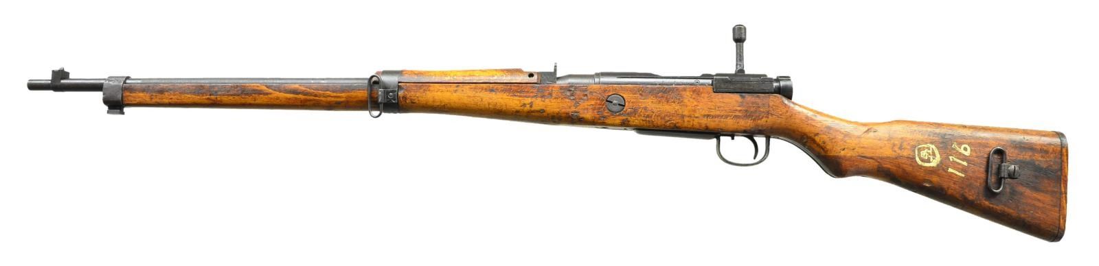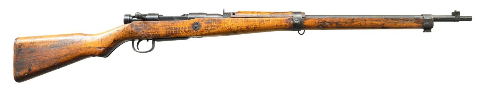 Cal. 7.7 Jap. S #58518. Bbl. 25 1/2". Extractor and safety are mismatched but other numbered parts are matching. Intact mum on top of receiver. Receiver marked on left side w/ 8th series marking, serial number & Nagoya symbol. Fixed aperture rear sight. Front sight w/out guards. Bayonet lug has welded construction. Left side sling swivels. Three nail wooden buttplate. Hardwood 2-piece stock set w/ short handguard. Forend made in 2 pieces; separate & loose between bands. Left side of stock has white paint Japanese markings w/ "116" rack number. Underside of pistol grip has strong Kanji marking. CONDITION: stock set shows a few dents, scattered dings & handling marks. Metal retains 65% original blue w/ overall fading & a few spots of light oxidation. Fair bore w/ some moderate pitting towards muzzle. (22-689/MJC). CURIO. $300-500.