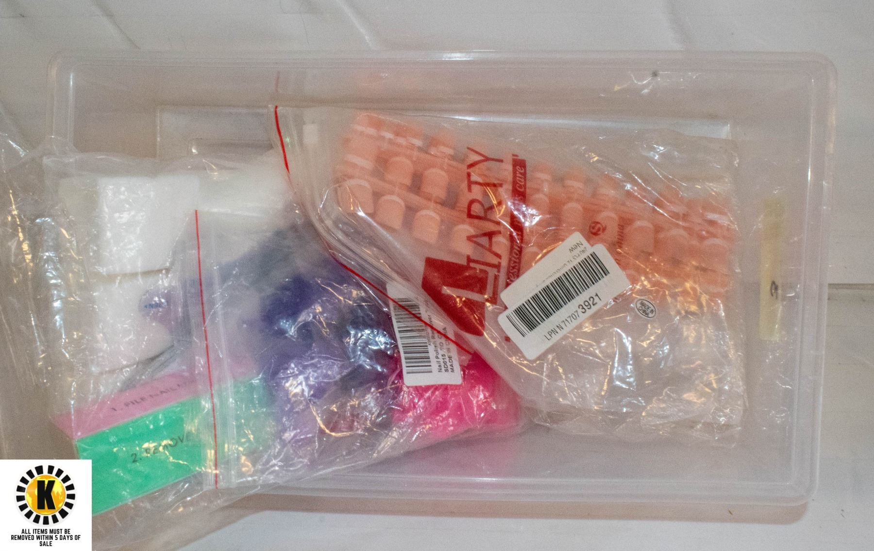 NAIL CLEANING CLIPS, 4 IN 1 BUFFING PAD, SPONGES, FINGER SEPARATOR, NAIL TOOLS AND 1 BAG OF ACRYLIC NAILS