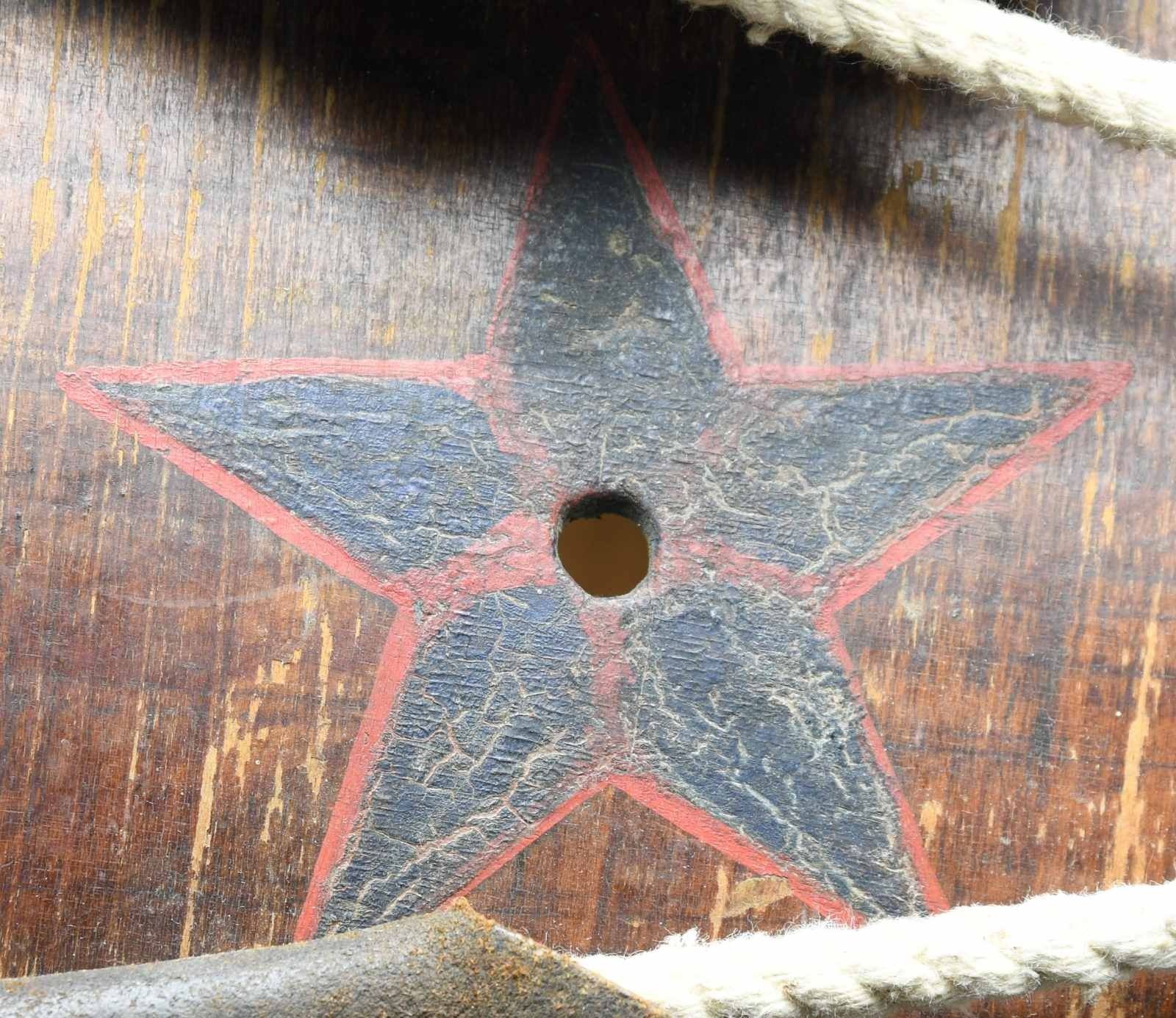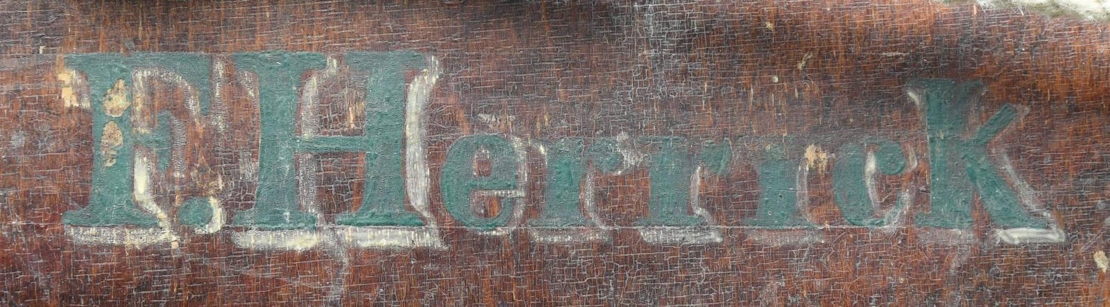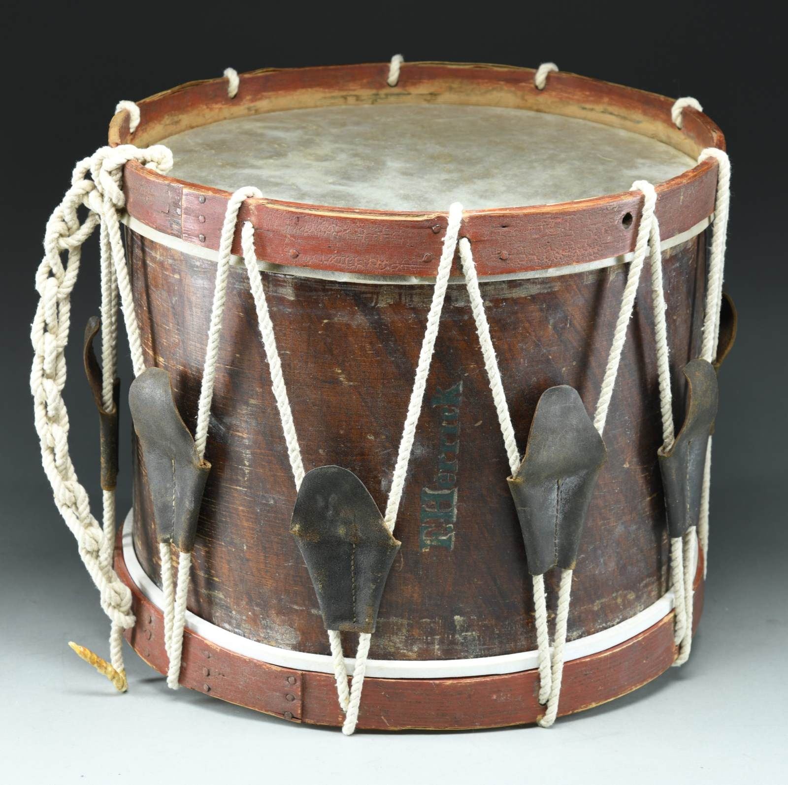 16.5" diameter, 14" high, painted patriotic shield & "F. HERRICK" on drum body. CONDITION: Very good overall, restored heads & ropes to playable condition. Fair to good original painted surfaces with staining & soiling. (02-19958/JS).