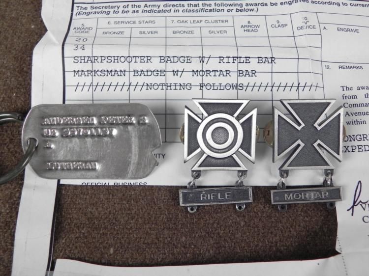 NAMED G.I. GROUPING INCL,SHARPSHOOTER BADGE/RIFLE BAR-MARKSMAN BADGE/MORTAR BAR+ PAPERWORK+DOGTAG * * AWARD DOCUMENT W/NAME & 2 AWARDS NAMED W/GI NAME, ALSO ON DOGTAG. AWARDS MARKED ON REVERSE *