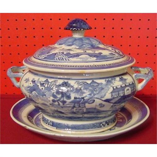 Circa 1800-1820 Chinese Export Blue and White Nanking Soup Tureen complete with Cover and Original Underplate. Made for the English Market. This mug Tureen measures 9" in height and 12" from handle to handle. Nice Blue Colors with Double Strapped Handle and a beautiful Mushroom finial. Typical Blue and White Nanking Chinese Export scenes of pagodas on a canal water with ships on the water. Excellent Condition and Very Good Quality. The measurement of the underplate is 12 3/4" X 10 1/2".